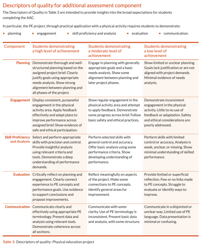This assessment is intended to integrate with and support ongoing learning, motivating students to engage deeply with the processes of planning, performing, and improving in physical activities while engaging with issues affecting physical activity.